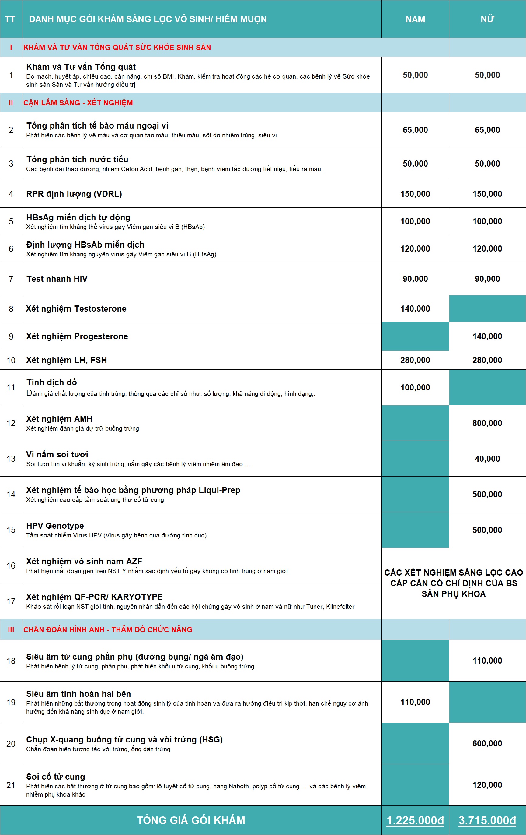 (Lưu ý: Bảng giá có thể thay đổi so với thời điểm đăng bài viết. Vui lòng liên hệ cho chúng tôi để được báo giá chính xác tại thời điểm khám. Tất cả các dịch vụ trong gói đều được thực hiện dưới sự chỉ định của bác sĩ Sản - Phụ Khoa)